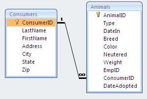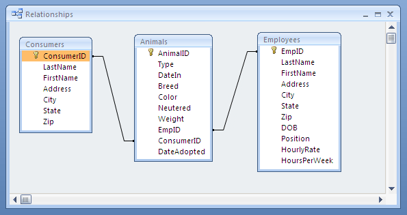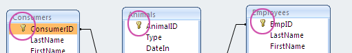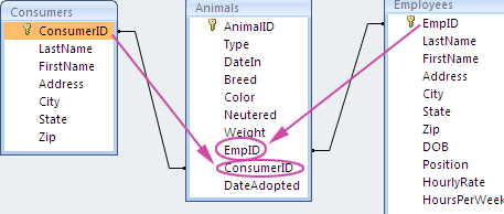 In the example below, EmpID is a primary key in the Employees table and a foreign key in the Animals table. ConsumerID is a primary key in the Consumers table and a foreign key in the Animals table.