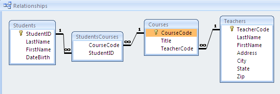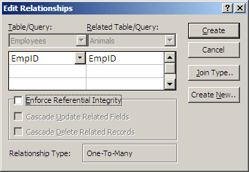 - relate them in the Relationships window (drag the primary key field from one table, drop it over the foreign key in the related table. The Edit Relationships dialog box appears.