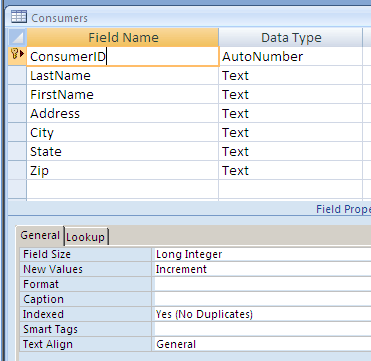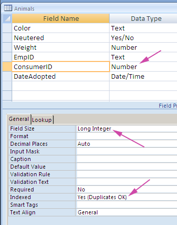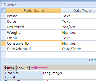 In the Animals table there is a field named ConsumerID - this is the ID of the consumer that adopted the animal. Click on the Lookup tab in the Field Properties area of the table design grid.