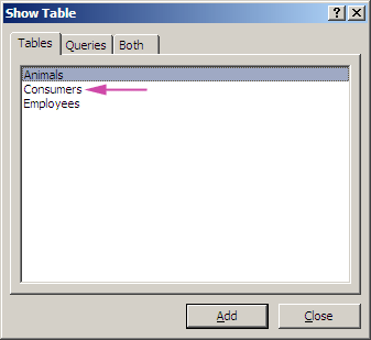 This displays the Show Table dialog box. The information we need to display in the Animals table comes from the Consumers table - so double click on the Consumers table to add it. Click the Close button to hide the dialog box.