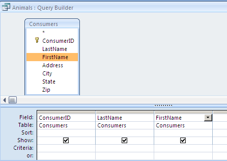 For the Animals table, we need to use the ConsumerID and we want to be able to see the consumer's last and first names. Double click on these fields, in that order, to add them to the bottom section of the Query Builder.