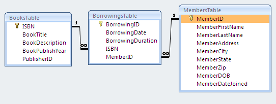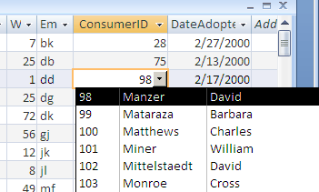 You can use a drop-down box to display data from another table. For example, when a consumer adopts an animal you would need to enter that consumer's ID into the Animals table. You could either memorize the consumer's ID or have Access show you a drop-down box to choose the consumer.